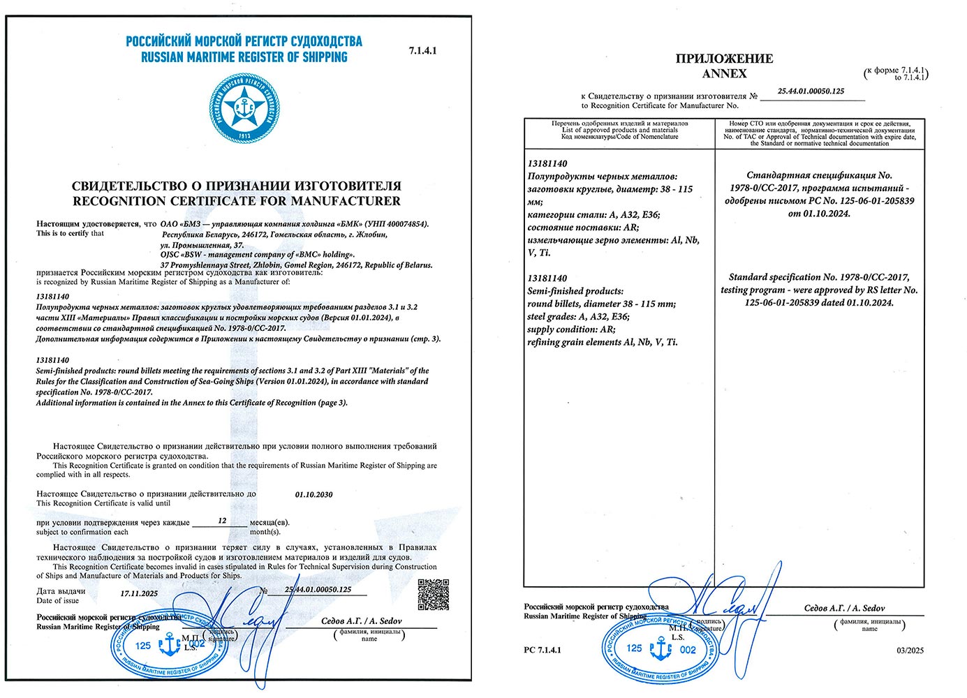 Свидетельство №25.44.01.00050.125 Полупродукта черных металлов: заготовок круглых удовлетворяющих требованиям разделов 3.1 и 3.2 части XIII «Материалы» Правил классификации и постройки морских судов (Версия 01.01.2024), в соответствии со стандартной спецификацией No. 1978-0/CC-2017. | БМЗ