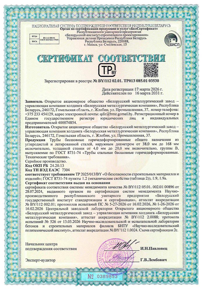Сертификат № BY/112 02.01. ТР013 085.01 03530 (Госстандарт РБ) на производство труб бесшовных горячедеформированных общего назначения из углеродистой и легированной сталей, наружным диаметром от 38,0 мм до 168 мм включительно, толщиной стенки от 4,0 мм до 20,0 мм включительно, группы В, выпускаемых по требованиям ГОСТ 8731-74 и ТР 2025/013/BY «О безопасности строительных материалов и изделий» | БМЗ
