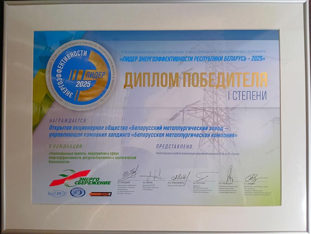 5 ноября — Белорусский металлургический завод награжден дипломом I степени на XI конкурсе «Лидер энергоэффективности Республики Беларусь-2025» в категории «Реализованные проекты, мероприятия в сфере энергоэффективности, ресурсосбережения и экологической безопасности». Общество представило проект реконструкции устройств компенсации реактивной мощности 33 кВ на ПС «Прокат». Проведённые мероприятия позволили увеличить эффективность системы электроснабжения предприятия в целом и работы подстанций в частности.