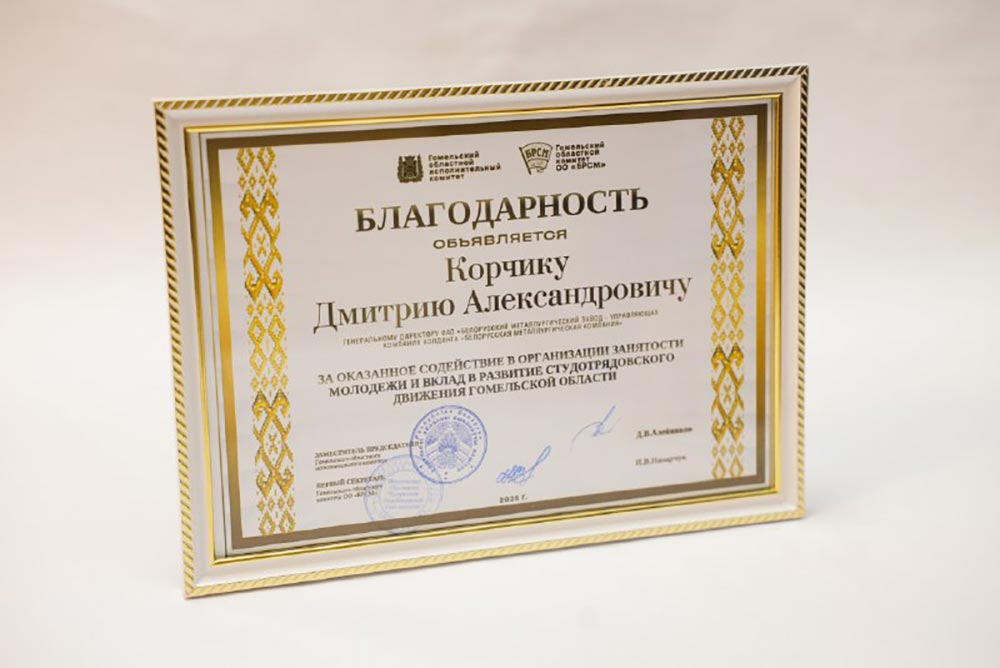 3 декабря — На торжественном закрытии Третьего трудового семестра-2025 генеральному директору БМЗ за оказанное содействие в организации занятости молодежи и вклад в развитие студотрядовского движения Гомельской области объявлена Благодарность Гомельского областного исполнительного комитета и Гомельского областного комитета ОО «БРСМ». А лучшим производственным студенческим отрядом области был признан жлобинский отряд «Прокат» имени командира 63-го стрелкового корпуса, защитника Жлобина Леонида Петровского.